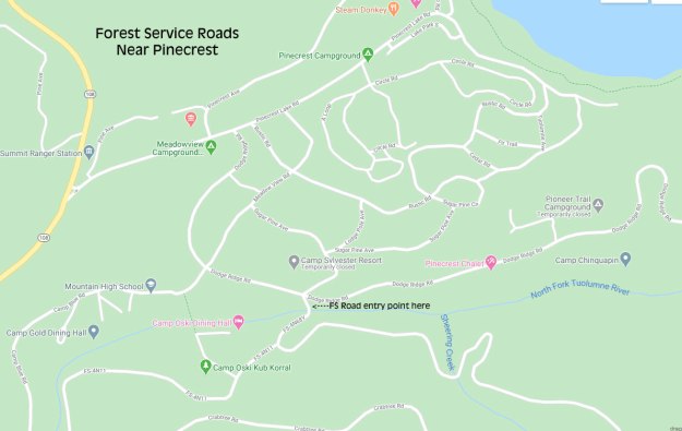 This is the one the best, shortest loop that takes to from Pinecrest to Strawberry and back with almost no biking on Hwy 108. You cross 108 twice and on the road for a just a short bit.