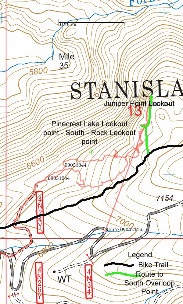 Map showing the South lookout points. We originally starting hiking from the end of 4N24Y but it is easier to leave the bike the trail at about the 7030 foot elevation to reach the lookout points.
